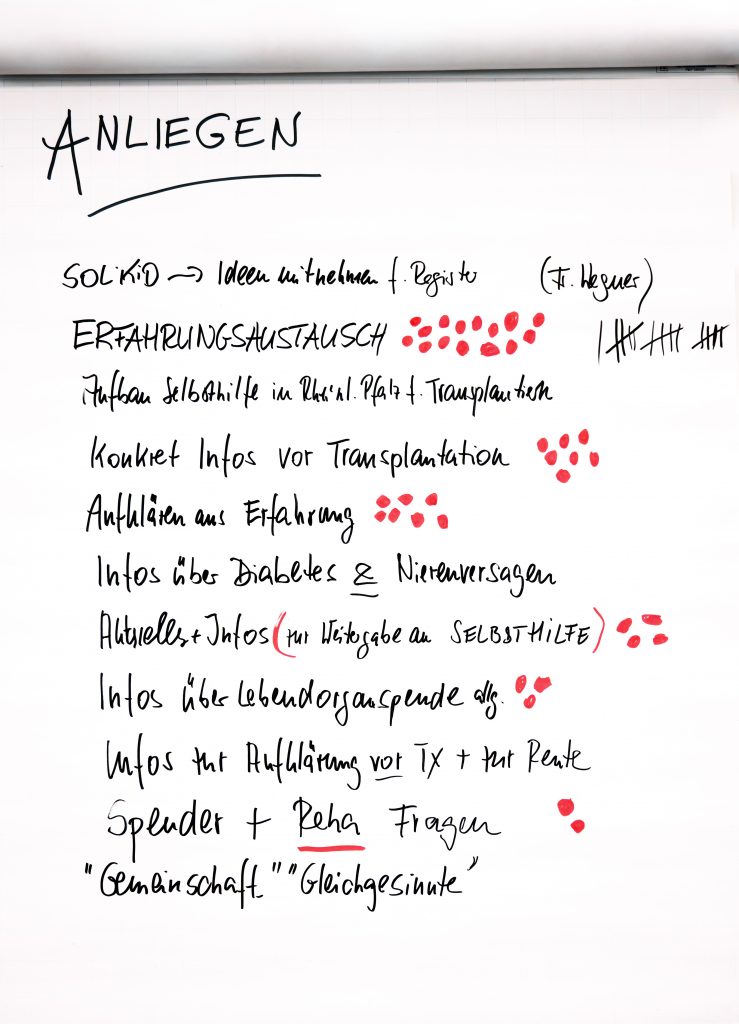 In einer anschließenden begleiteten Vorstellungsrunde lernten sich alle Teilnehmer:innen kennen und konnten so auch leichter persönlich aufeinander zugehen. „Wir haben es getan“, so lautete das Motto einer Runde, in der drei Paare, bzw. Personen von ihren sehr persönlichen Erfahrungen mit der Lebendspende berichten konnten. Danach war in zwei Gesprächsrunden ausführlich Gelegenheit, vertraulich über alle Fragen, Hoffnungen und Sorgen rund um die Lebendspende zu reden.