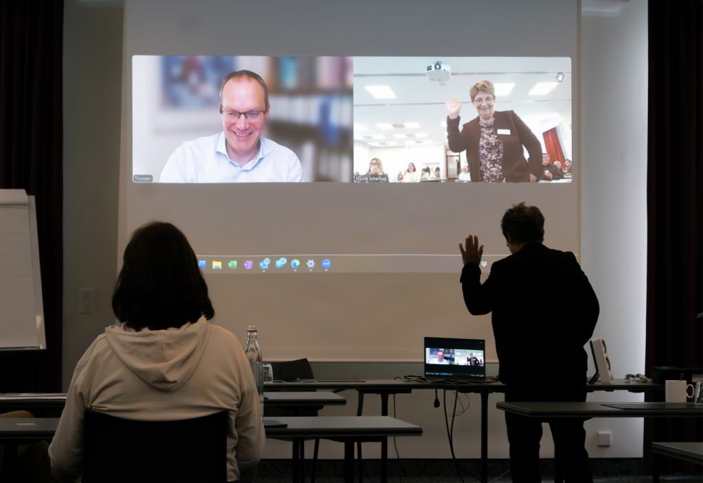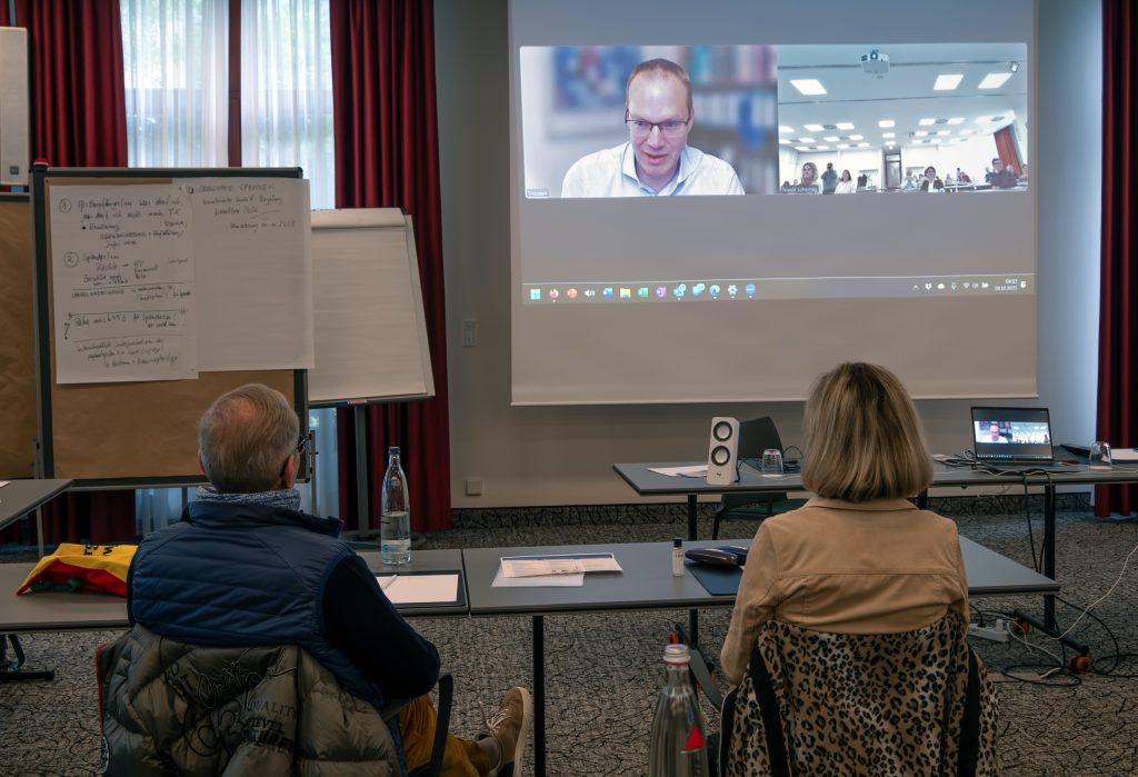 Der Sonntag begann mit dem großen Update zur Lebendorgantransplantation für Spender:innen und Empfänger:innen. Dazu war Prof. Thorsten Feldkamp per Video aus Kiel zugeschaltet. Nach seinem Impulsvortrag kamen sehr viele Fragen aus dem Plenum, das zeigt, wie groß der Informationsbedarf und der Wunsch nach einer unmittelbaren Fragemöglichkeit ist. Im Anschluss gab es bei der Fortführung der moderierten Gesprächsrunden vom Samstag wieder viel Raum für den Austausch. Diesmal teilten sich die Teilnehmer:innen so auf, dass in einer Gruppe die Lanzeiterfahrungen mit der Lebendspende im Mittelpunkt standen, in der anderen dagegen sozialrechtliche Fragen für Spender:innen und Empfänger:innen.